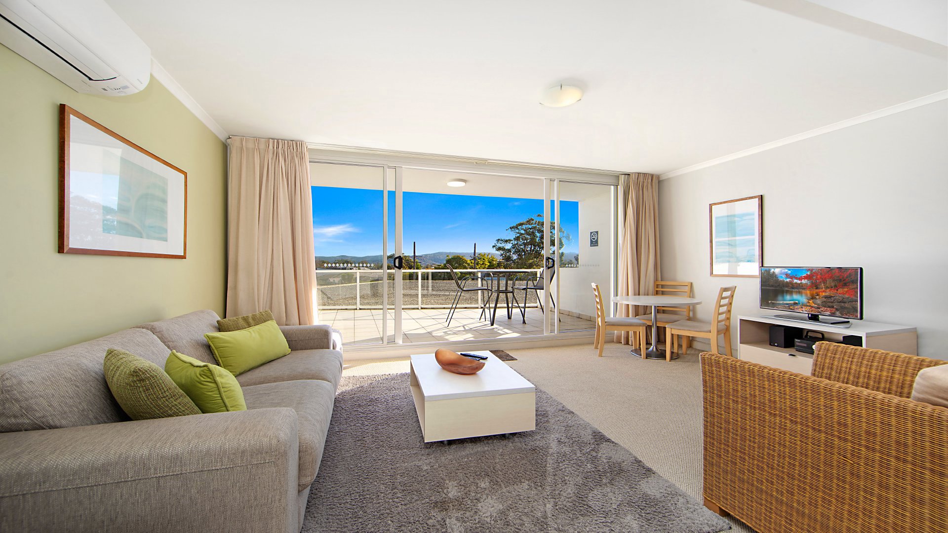 - Living space contains a digital TV, DVD player, balcony, views