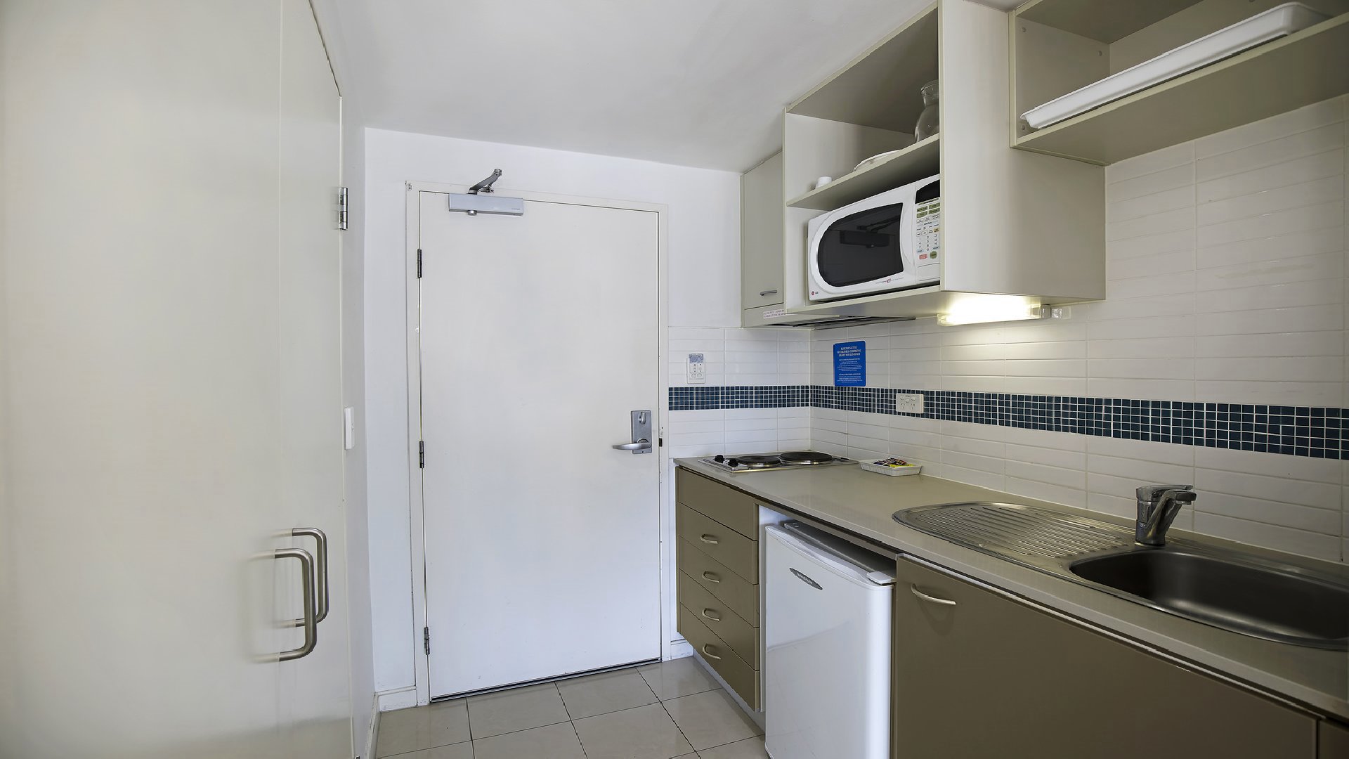 - Kitchenette with electric cooktop, bar fridge and microwave (no oven)